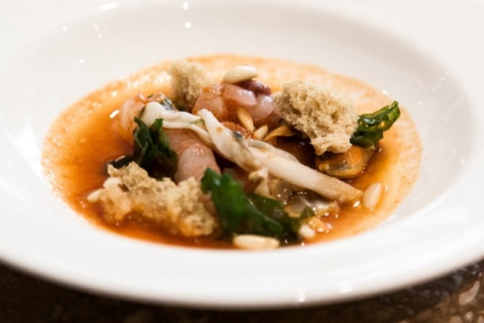 Zuppa di Plinio: zuppa di pesce locale con estratto di pino mugo e pinoli