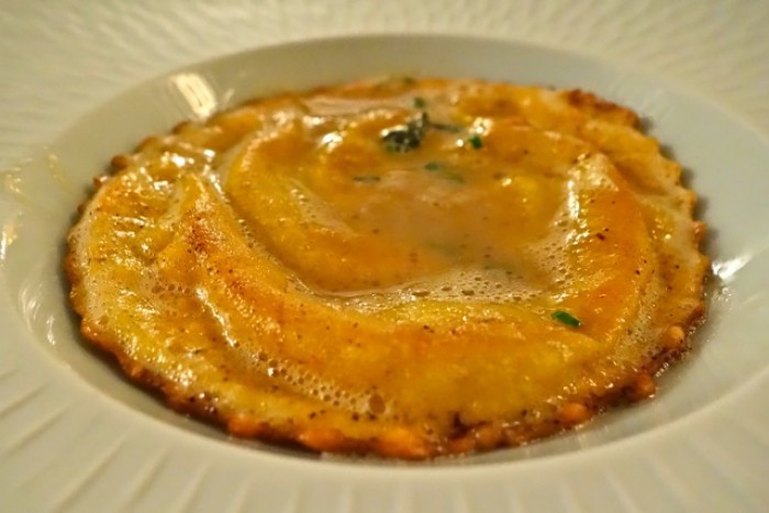 Dubbioso per il primo raviolo, di ottima pasta ma senza personalità, richiediamo di proporci una variazione sul tema. Lo chef Pellerei ci propone un’interessante reninterpretazione della Zuppa Valpellinentze. Questa, a base di fontina e verze, è qui racchiusa in un enorme raviolo, cotto a vapore e poi passato in padella nel burro. Per stomaci navigati, ma di grande personalità.