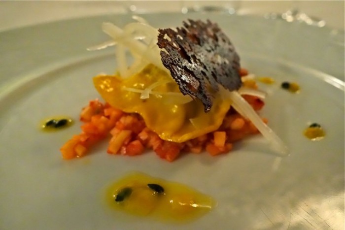 Amouse bouche: raviolo al foie gras con cialda di cioccolato fondente, tartara di pesca e frutto della passione. Un inizio col botto: acido, dolce e grasso. Appagante sotto ogni aspetto.