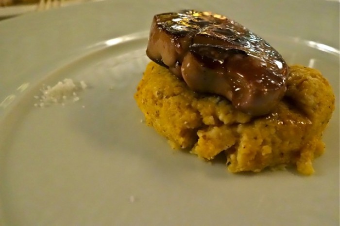 Polenta Rustica e Scaloppa di Foie Gras. Solitamente leggere “rustico” in un menù mi lascia molto perplesso, temendo sia sinonimo di “grossolano”. Non è questo il caso: la polenta, cotta sulla stufa a legna, presenta delle note amare ed affumicate, con una consistenza morbida ma compatta. Il netto contrasto con l’appagante foie gras la eleva, rendendola imperdibile per ogni gourmet “polentone”.
