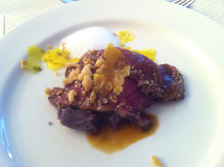 Con il secondo piatto si esce dalla costa versiliese e si va nell’entroterra, nella fattispecie a Pescia da Atman. Il piatto è infatti di Igles Corelli e si tratta de Il Fassone si fa tonno, un’ottima carne a fette (ho pure fatto il bis) poggiata su un letto di patate viola, affiancata a patate soffiate, aria di mare e chips di riso e pistacchi con una leggera salsa di soia, miele e sesamo.. La mano di Igles si sente, piatto molto buono, gradito anche dagli amici al tavolo.