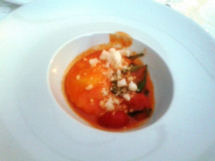 Si chiudeva un cerchio, in modo clamoroso, e Mario Donzelli, sono sicuro, mi guardava dall’alto e sorrideva felice: almeno un cazzo di bergamasco magna polenta gli aveva dato retta! Io non è che non voglia parlare dei fratelli Salvo, di Francesco e di Salvatore. Li conoscete. E’ che mi si sovrappone l’ombra di Chicco Cerea. Caxxo, questi sono tutti giganti, anche nel fisico. I due Salvo e due dei Cerea, appunto Chicco, e Roberto, l’autore di uno dei piatti più partenopei della serata, il raviolo caprese.