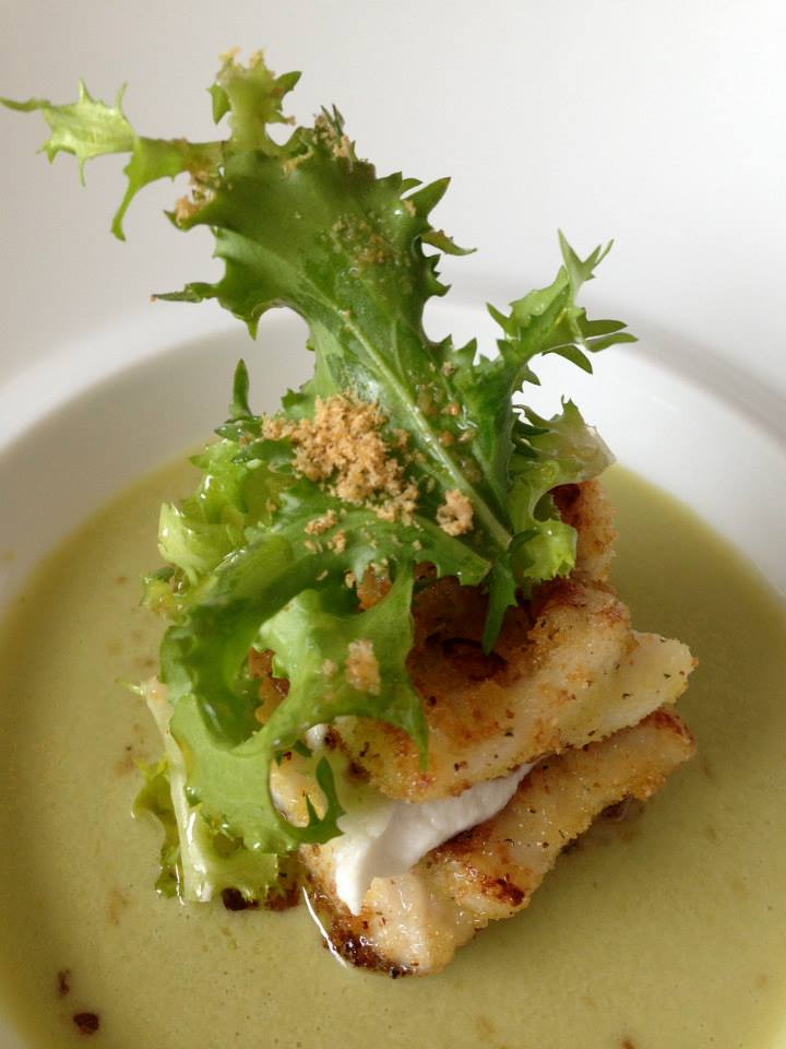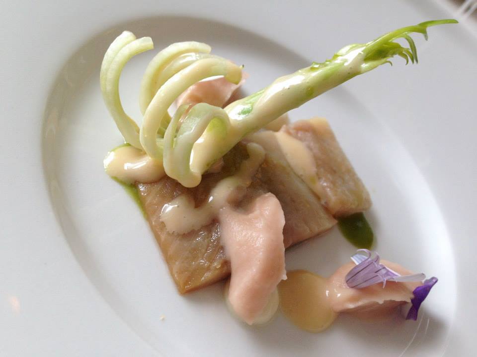 Siamo sospesi tra Nord e Sud con quest’altro piatto: il cavolo e l’affumicatura del merluzzo ci portano verso il Balitco, ma gli elementi abbinati possono richiamare indifferentemente la Francia e l’insalata di rinforzo napoletana con il baccalà