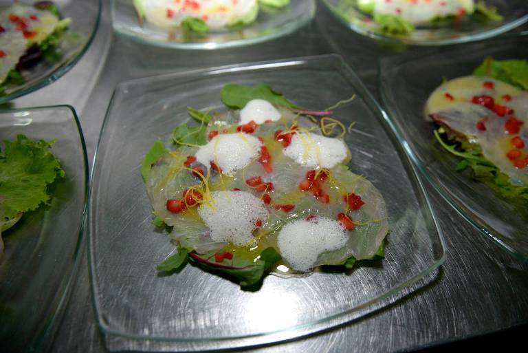 Due i primi: cavatelli mignon su ricotta liquida, cozze, maggiorana e polvere di olive infornate di Ferrandina e spaghettone di Gragnano in salsa di pomodoro giallo, baccalà islandese e liquirizia accompagnati dal Fiano 2008, che al naso offre aromi di pera, ananas e miele e al gusto sentori di nocciola e mandorla amara, e dall’annata 2002 che mostra una notevole capacità in termini di evoluzione con profumi di frutta e sentori mandorlati, entrambi vini che manifestano un ottimo livello di acidità.