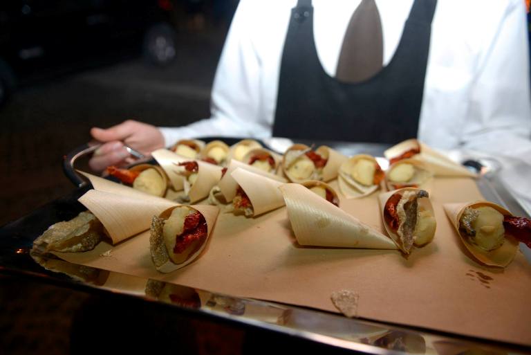 Al momento dell’aperitivo in piedi è stato servito il ‘Fish & Crusk’, un mini ‘cuoppo’ con baccalà in pastella, peperone crusco e chips di pelle di baccalà abbinato al Radici 2013, vino di colore giallo paglierino ottenuto dai vigneti di Santo Stefano del Sole, ampio al naso con profumi di fiori bianchi e una bella nota agrumata che si ritrova al palato.