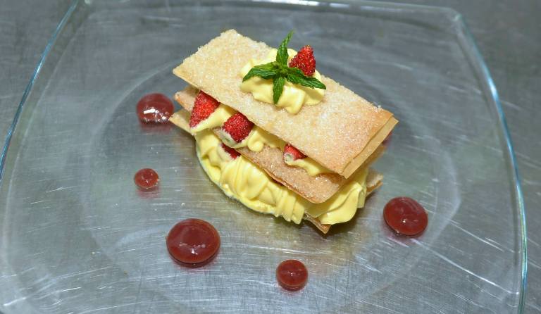 Conclusione affidata alla millefoglie con crema Chantilly ai fiori di ginestra e fragoline di Petina, piccola pasticceria e frutta essiccata gustate con il Melizie 2013, passito da Fiano in purezza di colore giallo intenso con riflessi dorati, sentori di frutta secca e miele al naso, molto intenso ed equilibrato al gusto.