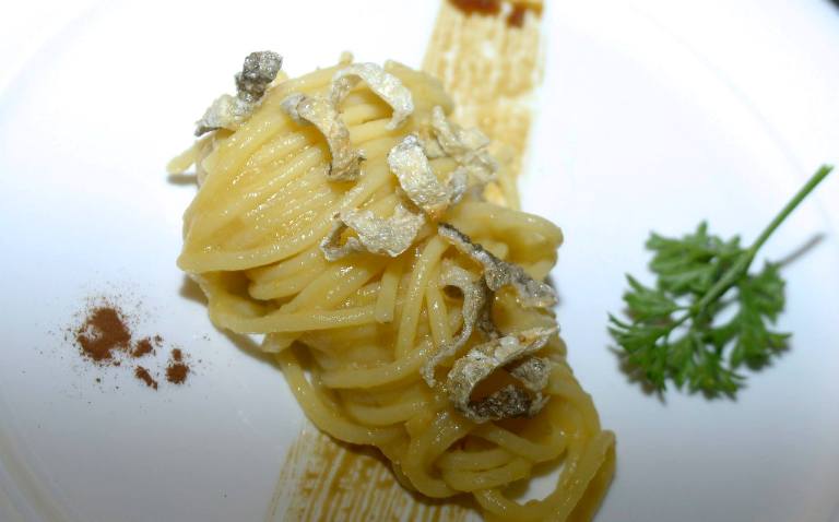Locanda Severino, spaghettone di Gragnano in salsa di pomodoro giallo, baccalà islandese e liquirizia