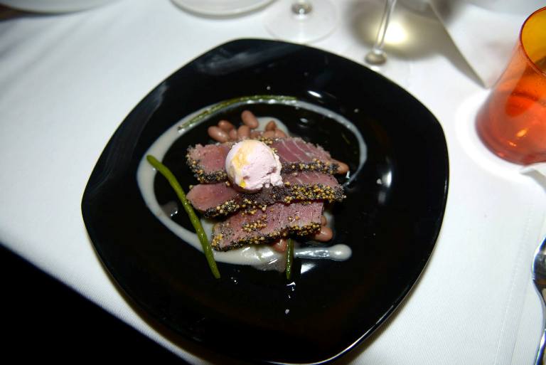 Locanda Severino, tonno di Cetara in crosta di sesamo con variazione di fagioli e gelato di cipolla rossa