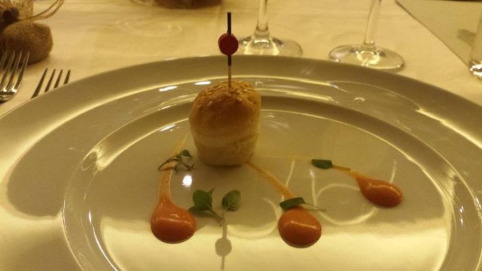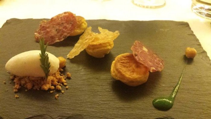 La cena ha avuto inizio con una entrée composta da un sandwich con burrino di bufala su salsa pizzaiola e da un antipasto di flan di ceci con soppressata e cremoso di parmigiano.