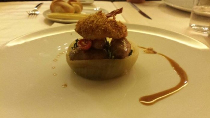 Per secondo salsiccia d’agnello su broccolo nero ripassata in sfoglia di cipolla cotta sotto sale.
