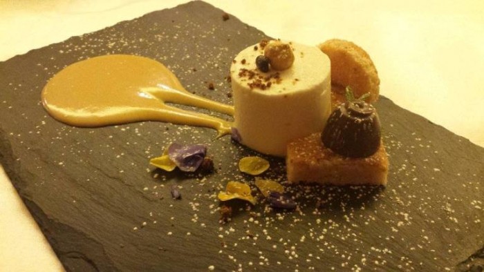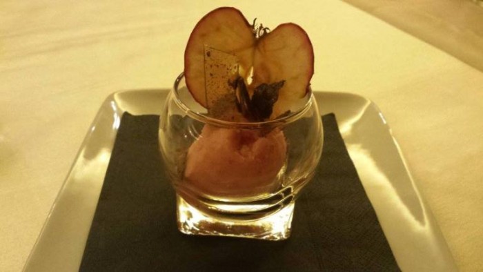 Rinfrescante il pre-dessert, sorbetto di mele annurche, cialdine disidratate e liquirizia cristallizzata, che ha preparato il palato alla chiusura dolce affidata a un ‘bisquit’ di nocciola tonda di Giffoni con il suo cremoso e mousse di caffè bianco.