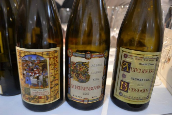 Il terreno a Bergheim è caratterizzato da un’ampia varietà geologica: argilla, marna e calcare, rocce dei Volsgi e sedimenti dell’era quaternaria. Anche la particolare topografia del luogo con torrenti, vallate e i suoi corridoi di vento compone una moltitudine di microclimi, contribuendo ulteriormente a dare identità variegate ai vini prodotti nei diversi appezzamenti. Sono quindi numerose le etichette in azienda e Jean-Michel, con grande generosità, durante la degustazione organizzata al Vinitaly, ne ha stappate un bel po’. Voglio raccontare quelle che mi sono particolarmente piaciute per evitare che il tutto risulti dispersivo e noioso. Engelgarten 1er Cru 2010, da uno degli appezzamenti di Bergheim più conosciuti, caratterizzato dalla forte presenza di greis. Qui il clima è piuttosto arido e nella vecchia vigna si allevano riesling, pinot gris, beurot, muscat, pinot noir. Il vino nel bicchiere evolve e cambia di continuo. Esprime grande complessità ed eleganza sia al naso che al palato. E’ avvolto in una veste minerale che mano a mano rilascia i vari sentori di idrocarburi, mela verde, muschio bianco e agrumi. In bocca è un bel divertimento, è pieno e dinamico, setoso e vivace nella spinta acida con ritorni minerali e di idrocarburi.