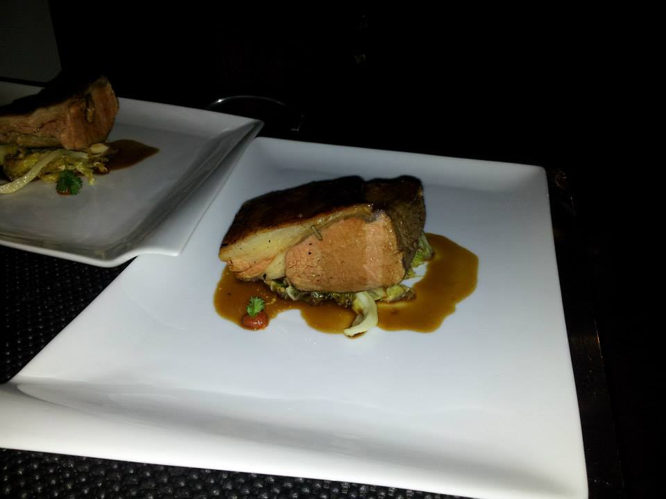 In apertura di cena antipasto di carciofo ripieno di robiolina di bufala e topinambur alla brace abbinato al Sauvignon Friuli Aquileia Superiore 2013 di Tenuta Ca’ Bolani. Di colore giallo paglierino tenue tendente al verdolino, al naso predominano note vegetali di peperone verde. Al gusto morbido, fresco e persistente.