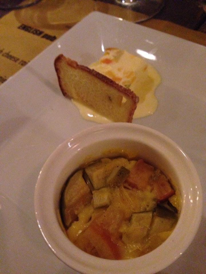 In conclusione il dolce riporta tutto in perfetta parità in quanto il sia pur delizioso bread and butter pudding non può nulla contro la quintessenza della dolcezza del semifreddo con canditi e bruschetta dolce.