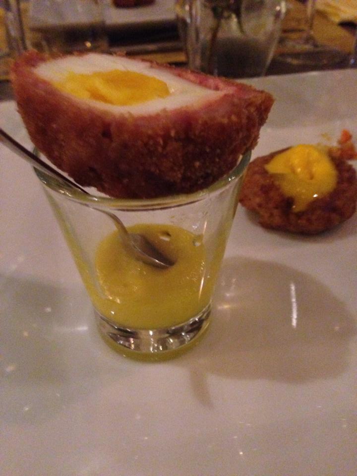 Per il giro di boa la coppia più goduriosa della serata rappresentata da scotch eggs – crocchetta di salsiccia e zabaione salato.