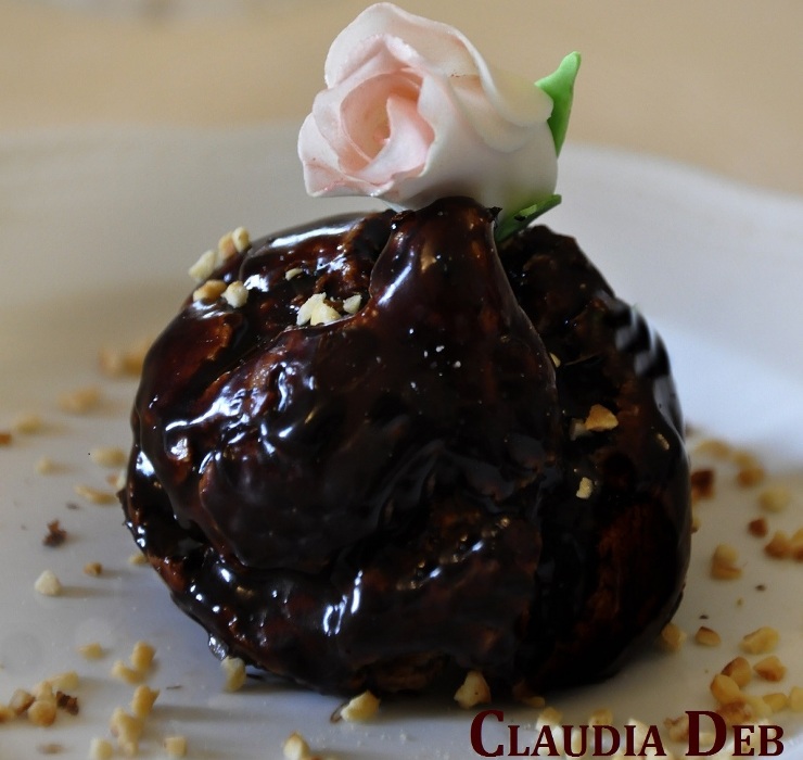 Assembla il dolce farcendo i bignè con la ganache alle nocciole. Ricopri il bignè con la salsa al cioccolato. Adagia una rosa di zucchero (trovi qui il tutorial).
