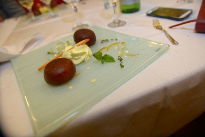 Dopo l’entrée antipasto composto da un cuore di carciofo ripieno con ricotta di bufala, scampi e limone.