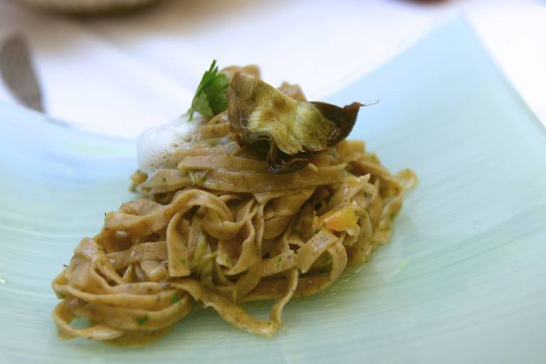 Taverna Falanghina, tagliatelle di grano saraceno con carciofi arrosto, ciacianielli e spuma all’aglio
