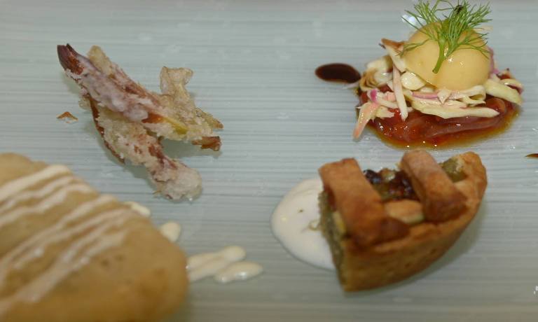 In apertura una variazione di carciofi con calzoncello ripieno di carciofo, crostatina di carciofi, carciofi in pastella e carpaccio di carciofi crudi.