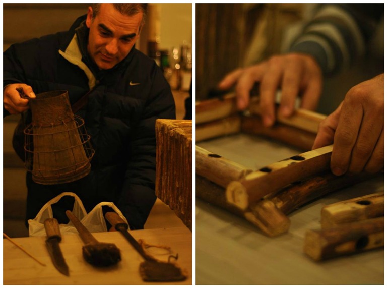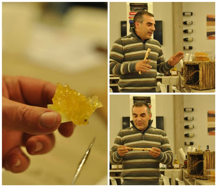Dentro quel fascetro, un’arnia prodotta con legni di ferla dai mastri apicoltori di Sortino in provincia di Siracusa, abbiamo potuto immaginare la sapiente e instancabile opera delle laboriose api, abbiamo rivissuto il mito di Aristeo, onorato come un Dio in Grecia per aver insegnato agli uomini l’arte dell’apicoltura e che una volta scacciato dall’Olimpo sembra abbia ricominciato proprio in Sicilia a riprodurre artificialmente le api e a sfruttarne il miele. I Maestri Fascitrari raccoglievano il miele senza praticare l’apicidio per annegamento ed asfissia rispettando l’equilibrio naturale e non compromettendo la qualità del miele stesso dimostrando così grande attenzione per l’ambiente e il prodotto finale. Con la stessa passione , Carmelo Musimeci (l’ultimo dei Fascitrari) e Sebastiano Saccuzzo che incarnano lo Spirito degli ultimi Fascitrari ci hanno accompagnato per mano facendoci rivivere la storia della tradizione apistica iblea, della torchiatura dei favi, del miele puro e genuino che profuma di timo, della cera impregnata di miele, di zuccheri, pollini e propoli e della felice e “carbonara” idea dei Fascitrari di distillare l’acqua di scarto che derivava dalla lavorazione dei prodotti derivati dalla per ottenere un preziosissimo “nettare” custode di tutti i sapori e i profumi dell’arnia. Così anche grazie a Manuela Laiacona, giornalista e blogger enogastronomica, che ha sposato la causa degli ultimi Fascitrari, nella piacevolissima cornice di QQucina Qui si sono respirati e gustati i profumi d’autunno inoltrato e di miele dell’affettuoso menù voluto da Bianca Celano.