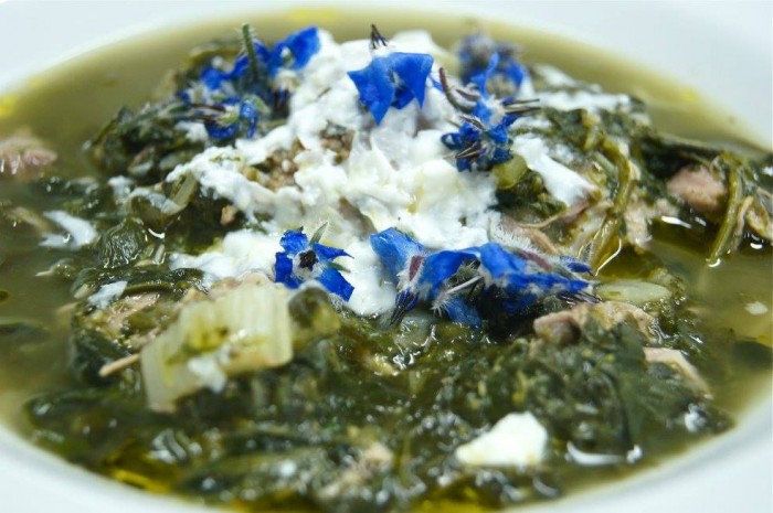 Antipasto: minestra di Pasqua in brodo con gallinella di maiale e fiori di borragine