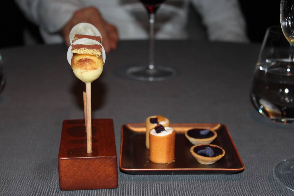 Riso carnaroli autentico “Riserva San Massimo” scampi, limone, rosmarino, capperi. Il riso è mantecato con la parte bianca del limone sbollentata una quindicina di volte reso crema a cui viene aggiunta un 20% di panna. Invece di giocare sull’acidità netta e tagliente del limone, si gioca su diversi livelli di acidità a volte soffusi a volte più decisi, la dolcezza della tartare di scampi serve a resettare il palato a prepararsi ad una nuova sfumatura del limone, molto buono e particolarmente nelle mie corde.