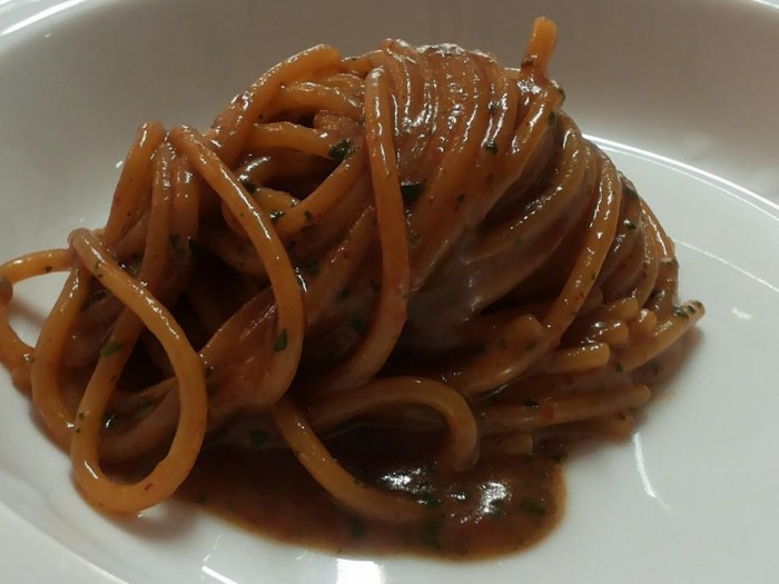 A questo punto l’ardua interpretazione della pasta che non è proprio il suo habitat naturale.