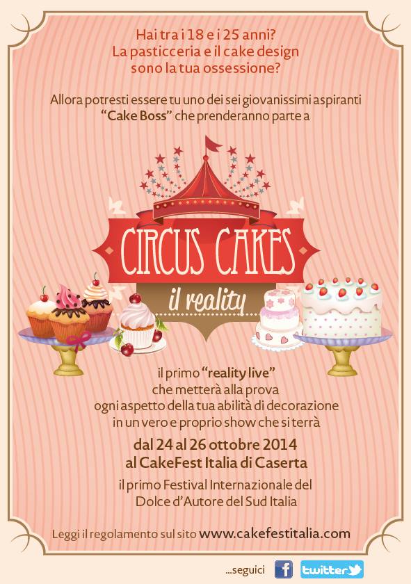 The Circus Cakes® è un nuovo reality show, creato da me e dedicato a giovanissimi Cake Designer che si articola in sei puntate realizzate proprio dal CakeFest Italia di Caserta. Un format originale che racconta la storia di sei ragazzi che vivono in luoghi diversi d’Italia, lontani ma con due uniche passioni in comune: la pasticceria ed il cake design. Ragazzi talentuosi con il sogno di diventare dei professionisti affermati ed aprire una loro “Bakery House”. Al The Circus Cakes® concorreranno ragazzi e ragazze con un’età compresa tra i 18 e i 25 anni, con una preparazione in pasticceria ed un talento innato nella decorazione dei dolci.