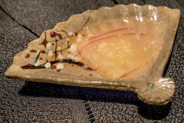 (Freddo) Sette delicatezze oceaniche. Un classico della cucina Kaiseki, materie prime molto fresche e minimamente trattate. Interessante il fegato di rana pescatrice e l’abalone (un enorme mollusco di cui vanno pazzi in oriente, ancor più che per il suo sapore, probabilmente, per la sua forma che richiama proprietà afrodisiache. Lo troverete praticamente in ogni ristorante di lusso), servito col suo fegato.