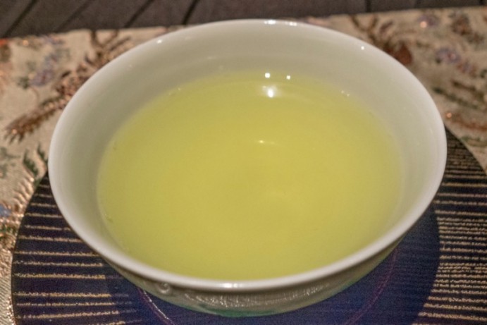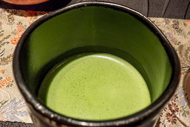 Il finale, tè macha, preparato secondo la cerimonia del “Cha No Yu”. Di una tipologia piuttosto anomala, dal sapore molto intenso, ma molto (molto, credetemi…) tendente all’amaro, perfettamente preparato con la tipica frusta di bambù.