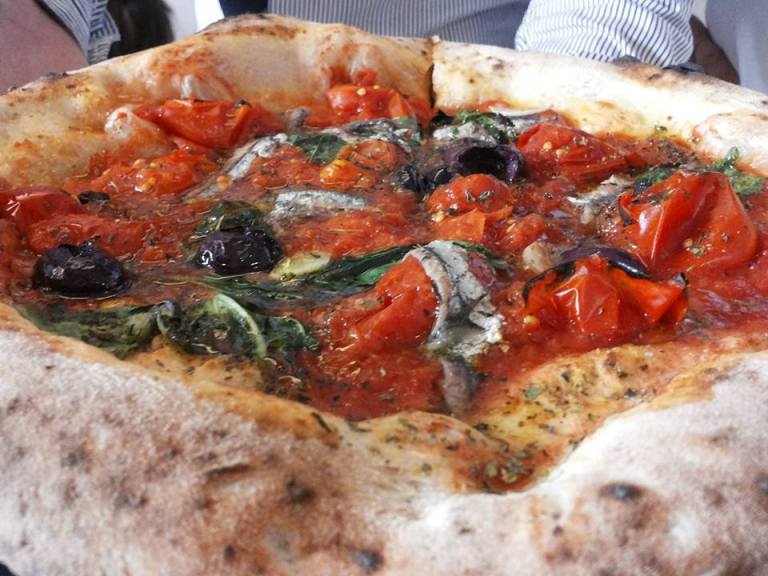 Pizza Napoletana ai due pomodori: San Marzano, pomodorino del piennolo del Vesuvio, alici di Cetara, origano, basilico, aglio., olive di Gaeta