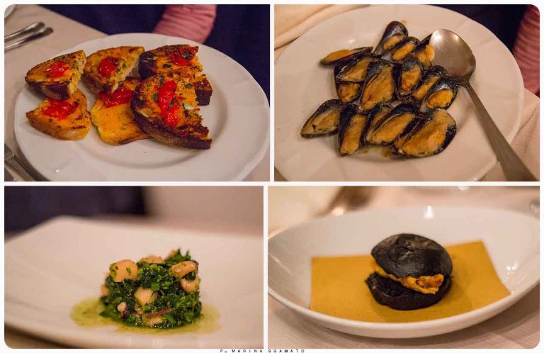 Bruschette con pomodoro del Piennolo, Cozze gratinate al limone, Seppia con Friarielli, Panino con frittatina di Cozze