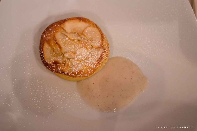 Il dolce è sempre il piatto suadente, in una cena. Gustoso è il tortino di Melannurca, aromatizzato alla cannella, su un bacino di crema d'Arancia.