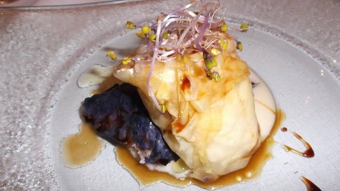 Terza portata: Involtino di verza al pesce azzurro del golfo, ricotta di podolica e riduzione di miele di fichi bianchi cilentani. Ecco qui un piatto veramente straordinario, che vale da solo il viaggio a Villammare! Oltretutto si tratta di una composizione prettamente territoriale che riesce ad esaltare tutto i sapori della magnifica terra cilentana: pesce povero, ricotta fresca, fichi deliziosi e verdura, il tutto bene assemblato. Le verze in effetti sono due, quella bianca più delicata che funge da contenitore per l’involucro ed il cavolo nero all’esterno che è più consistente e croccante. Piatto nell’insieme semplice ma veramente gustoso.