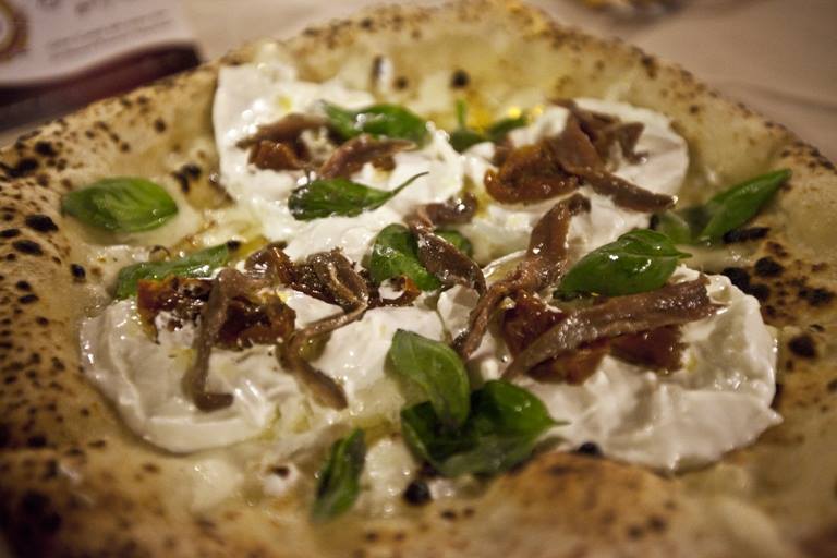 Durante la mia visita ho assaggiato le montanare, il calzone fritto con mozzarella, ricotta e salame, la Perle Campane con fior di latte, ciliegine di bufala, pomodori corbarini, del Piennolo e San Marzano, la Venere Bianca con burrata, pomodori secchi e alici di Cetara e la torta al pistacchio.