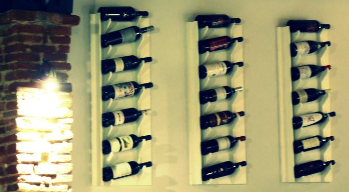 Pareti ad appoggiar bottiglie. Tavoli e sedie bianche. Rilassante.