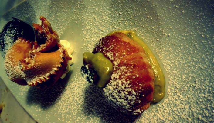 Tortino cioccolato caldo, cannolo di crema adagiato in una crema di pistacchio e visto il periodo di carnevale una “chiacchera” con crema ad accompagnare.