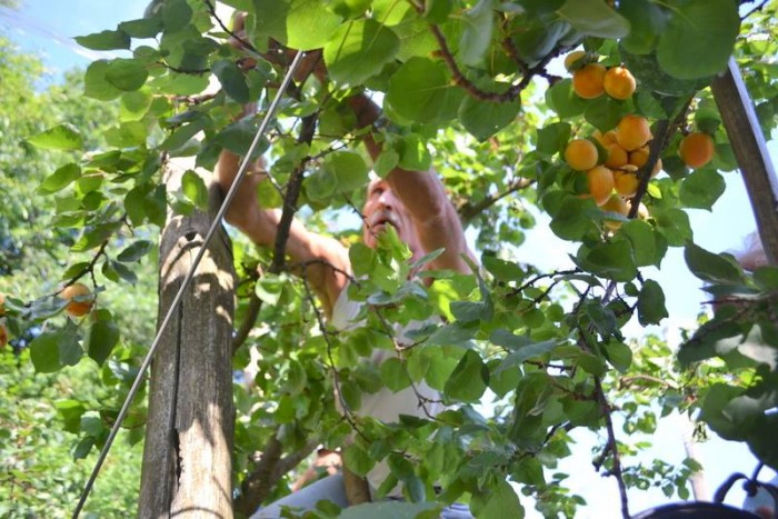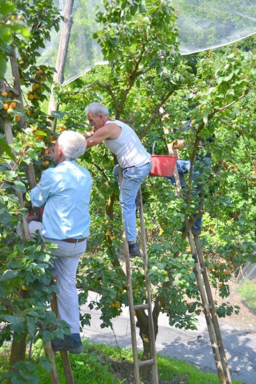 E’ una scena ormai che appartiene al passato perché tutto sembra andare contro le piccole produzioni agricole ed artigiane. Assurdo paradosso questo dove chi fa qualità e si affanna per far sopravvivere le colture tipiche del suo territorio, e quindi si impegna a custodirne la storia e le tradizioni, è destinato a soccombere per le troppe difficoltà. Diciamo pure che la gelida indifferenza da parte dei consumatori e delle istituzioni competenti ha il proprio peso. Eppure Mario, affiancato dal figlio Vincenzo, resiste con caparbietà alla dinamica perversa di sfruttamento degli intermediari locali che impongono prezzi eccessivamente bassi che strozzano i piccoli agricoltori. Venti centesimi al chilo è la tariffa di acquisto dei grossisti di zona. Praticamente una condanna a morte. Mario ha settantaquattro anni e la grande energia che trae da questo luogo incantevole gli permette ancora di risalire con agilità le ripide terrazze e di dedicarsi a tempo pieno al suo albicoccheto. E’ riuscito ad inserirsi nel circuito di una grande distribuzione attenta alla tipicità ed alla qualità, portando il prezzo canaglia di venti centesimi ad un euro e trenta. Ha garantito in questo modo alle sue albicocche di poter ancora essere colte e distribuite sul mercano con dignità.