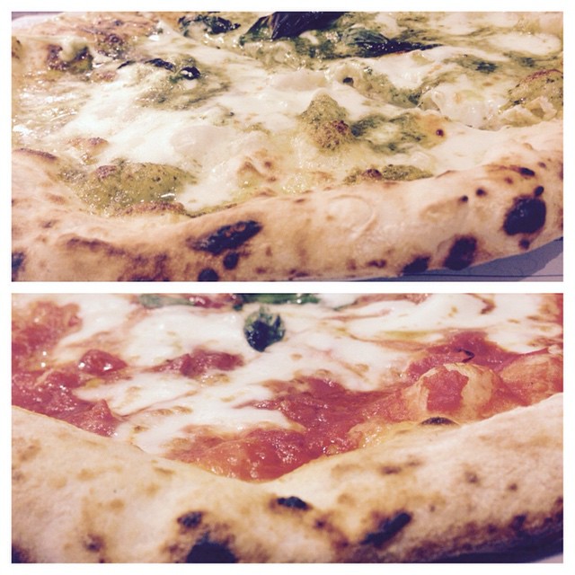 Poi la margherita gialla – conciato romano, provola misto bufala e pomodorini gialli “Lucariello” – delicata e in perfetto equilibrio gustativo, cui manca forse qualcosa per decollare, magari un che di sapido (le alici, per dire) per contrastare la dolcezza del pomodoro utilizzato. Infine, la “pesto di basilico” – con la provola misto bufala e il pesto “Fratelli Rossi” – che immaginerei forse più leggera nel sapore. A mio gusto, eh.