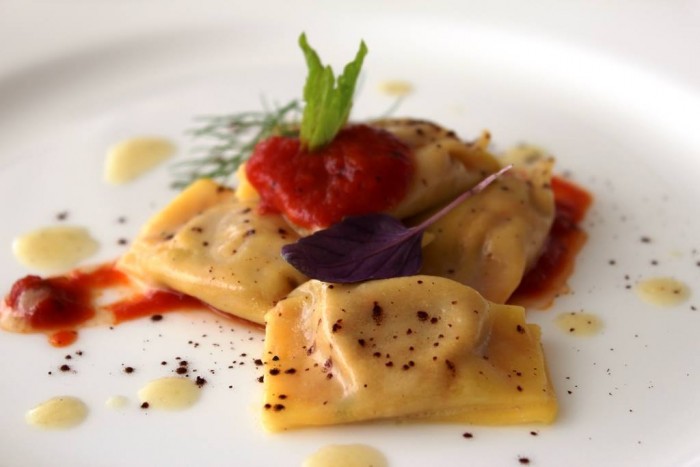 Altro pensiero intelligente per i fagottini con ragù, ricotta e polvere di cacao. Siamo in Campania in provincia di Napoli, il ragù è religione e non averlo in carta sarebbe un delitto. Nel periodo estivo ovviamente può risultare pesante e il pensiero vincente è quello di inserirlo nei fagottini, ingentilito dalla ricotta, poca, quindi ben dosata e amplificati nella sensazione gusto olfattiva dal cacao.