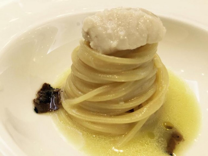 Buona tecnica anche nei primi, ricchi di materia, mai scontati, come questo spaghetto che però noi a Napoli, essendoci un fondo di brodo, buonissimo e da bere a secchi, avremmo usati spezzati.