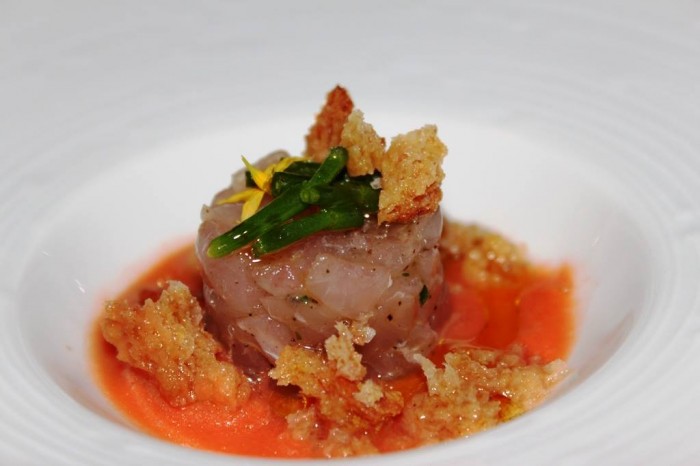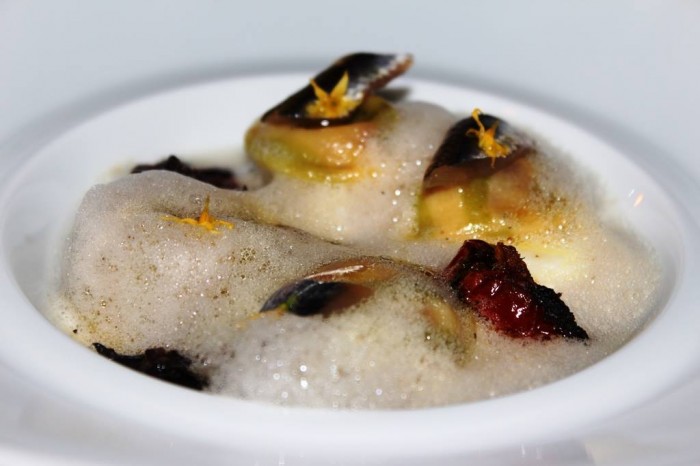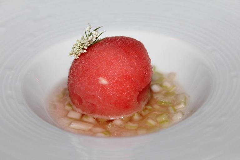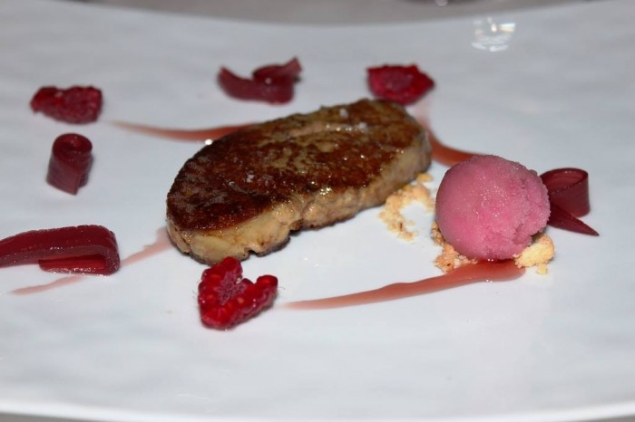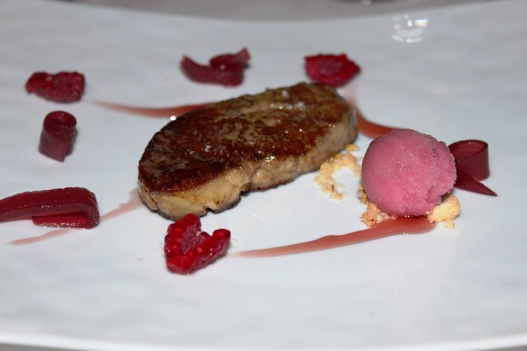 Di altro genere, ovviamente il fegato grasso d’oca con sorbetto di cipolla rossa e lamponi, mi riferiscono di una cottura magistrale e del bel contrappunto di freschezza.