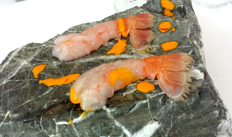 In fondo alla grande sala, il quadro lo vedi subito, perché racconta la luce, la stessa che filtra dalle vetrate, sommando bianco ad altro bianco. E’ una spiaggia desertica lambita da un mare bonaccioso, sabbia e increspamenti all’infinito: eppure c’è un’inquietudine, un senso di precarietà che filtra attraverso tre squarci bui, forse l’interno di un mostruoso edificio abbandonato. Desiderio di luce e di pace, in un mare piatto, basso e sospetto, un mare d’inverno difficile, da mettere a fuoco, in continuo movimento. Così i piatti di mare sembrano ritrovamenti sulla battigia: il mare che dona, il mare che porta via. Scampi crudi arenati su uno scoglio e macchie di zafferano come anemoni di mare; un concassé di cetriolo come un’alga, non abbastanza agra, che avvolge le capesante portate a riva dalla risacca, tra schiuma, feta e carta stagnola; lo sgombro che è un legno bruciato e amaro alla deriva su un catrame di yucca, dolcenera. Non c’è gioco di memoria, ma suggestioni africane e contaminazioni orientali: cucina asciutta, senza filtri, quasi primitiva, tuttavia attraversata da una ruvida complessità che intriga. E se dispiace che il piccione, forse ucciso dietro la duna, ammorbidito nell’amaritudine, non sanguini copioso, scopri equilibri sulla via del tabacco nella millefoglie di cioccolato e lenticchie, e soprattutto in un grumo di maltagliati di grano saraceno, freschi di burrata e trafitti da acciughe marinate: sintesi ancestrale, quasi drammatica, tra la prepotenza iridescente della carne del pesce e la rugosa dolcezza della pasta e del latte. Troppo facile cucinare un mare da cartolina: camminando sulla riva si possono scoprire piccole cose preziose.