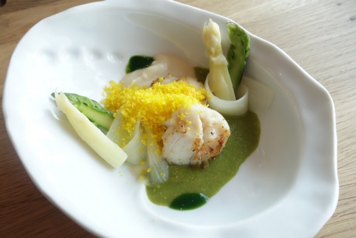 Capasanta “tuttasparago” con bottarga dʼuovo. Visivamente ci sembra seduta, ed il gusto lo conferma. Un piatto troppo addomesticato, troppo dolce, che non sorprende, e con una capasanta di suo non eccellente.