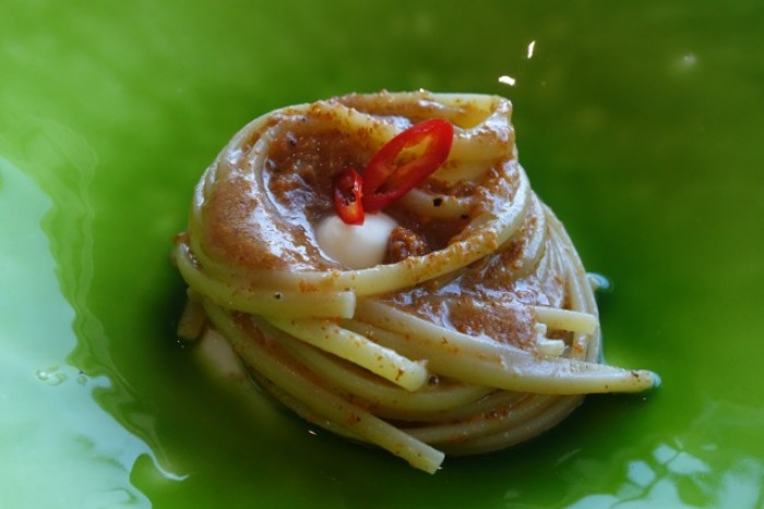 Di gran scena la linguina al riccio di mare con clorofilla di prezzemolo e peperoncino fresco. Il riccio non è di quelli freschi, ma a Milano il pesce non arriva tutti i giorni? Peccato, perchè lʼaspetto è ottimo, con questo verde clorofilla, ma il sapore è decisamente debole, tranne che per il peperoncino fresco, che esplode al contatto con la lingua, per poi sparire lasciando il giusto spazio agli altri sapori.