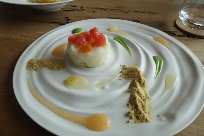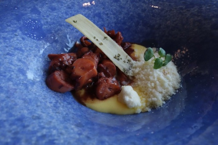 Polpo con patate in tre maniere: cialda, granita e crema. Un polpo di media fattura, ben insaporito, con questo mix di patate davvero di troppo, omogeneo nei sapori, insignificante, senza slanci e con una granita quasi fastidiosa nel suo essere scialba.