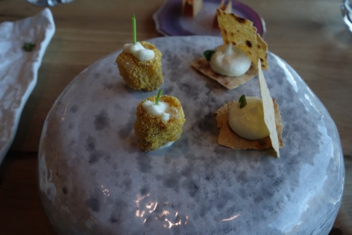 Pane carasau e baccalà a destra, a sinistra crema di pecorino fritto: