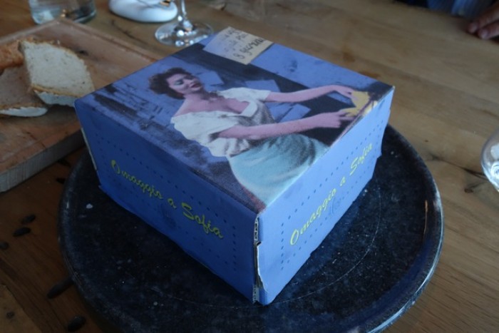 E, prima delle portate del menù, una nostra richiesta extra, la pizza fritta, portata in tavola con una simpatica confezione: