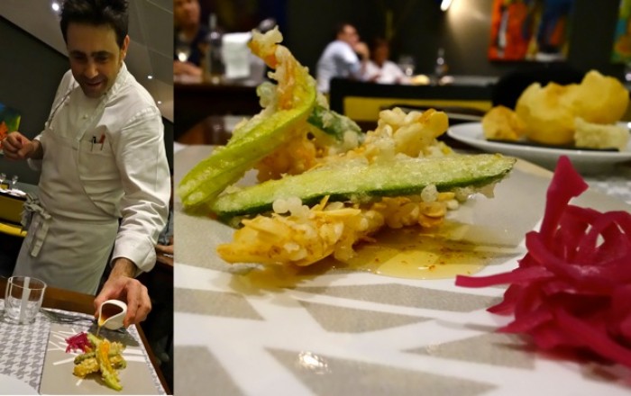 Arrivano gli stuzzichini: grissini fritti ripieni di parmigiana di melanzane, cannoli con patè di pollo e grissini speziati (curry, pomodoro, nero di seppia…). Interessante l’utilizzo esteso delle spezie, con un piccante avvolgente, che scalda il palato e lo prepara alla cena.