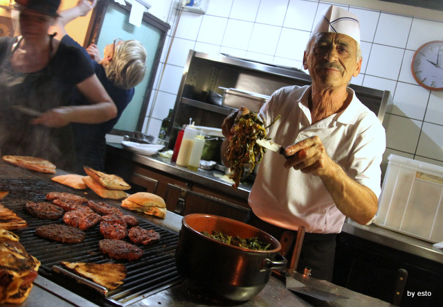 Lo porge con garbo a chi sembra impaziente e poi ritorna tra i fumi odorosi: qua i friarielli, là i peperoni; su la salsiccia, giù la bistecca. Flavia e Rita gli danno una mano.